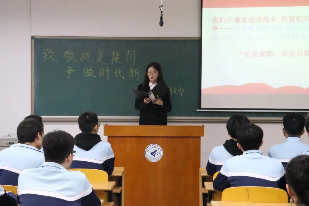 在本次班团会中,主持人就以上三部分内容为同学们进行了解读,为大家讲述了抗美援朝战争中从毛泽东主席作出“抗美援朝,保家卫国”的伟大战略决策、志愿军誓师大会到志愿军凯旋归国的艰辛过程。同学们也积极发言,和大家分享自己对于这段历史的感悟与体会。